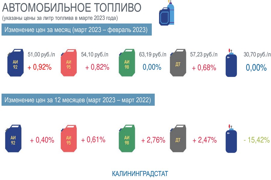 По информации статистики, в марте 2023 года цена на бензин АИ-92 по сравнению с февралём выросла на 0,92%, бензин АИ-95 — на 0,82%, дизельное топливо — на 0,68%. Цена на бензин АИ-98 и газовое моторное топливо осталась без изменений.