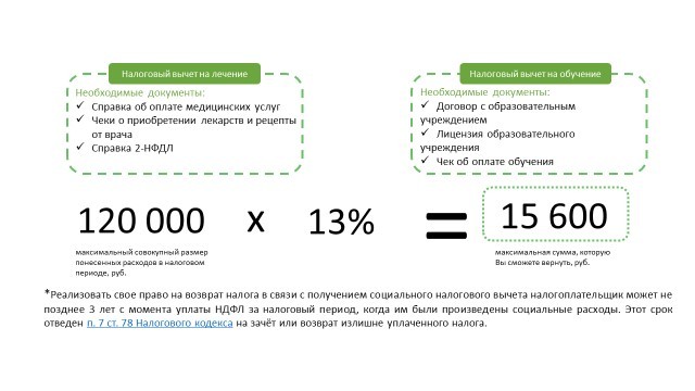 Виды вычетов?Социальный. К данной категории относятся вычеты на страхование жизни, обучение, лечение, благотворительность, фитнес, добровольное медицинское страхования (ДМС) и негосударственное пенсионное обеспечение (НПФ). Максимальная сумма, с которой можно вернуть 13% по данному типу вычета – 120 000 рублей**, что в цифровом исчислении составит 15 600 рублей. В Россельхозбанке существует широкая линейка страховых программ. На налоговый вычет могут претендовать клиенты, оформившие программы накопительного и инвестиционного страхования жизни.