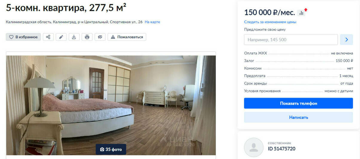 Трёхкомнтаная квартира в ЖК «Рыбная деревня». Скриншот сервиса «Авито» 4. Четырёхкомнатная квартира на Курганской за 110 тысяч рублейЕсть бытовая техника, мебель, проведён интернет, кабельное телевидение, есть даже розовая балерина на входной двери. Автор объявления на «Циане» также сообщает, что дом находится в «суперлокации»: рядом детские сады, школы, торговые центры и супермаркеты.