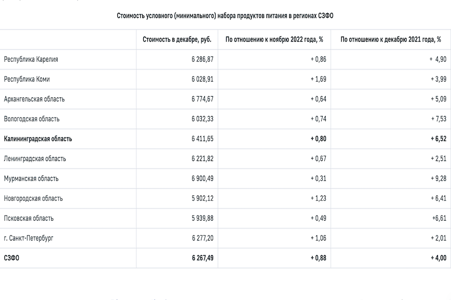 Среди российских регионов «соседями» калининградской области в декабре, как и месяцем ранее, стали Архангельская область, где набор продуктов стоит 6 774 руб. (+0,64% по сравнению с ноябрём) и Амурская область — 6 366,92 (+0,23%).