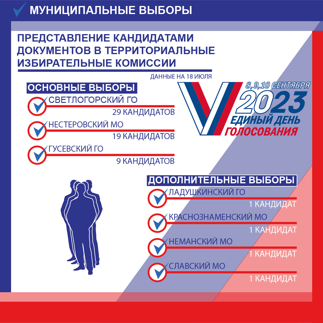 Муниципальные выборы депутатов окружных советов пройдут 8,9 и 10 сентября в 7 муниципалитетах – основные в Гусевском, Светлогорском и Нестеровском округах, дополнительные в Славском, Ладушкинском, Краснознаменском и Неманском округах. Выдвижение и представление документов на регистрацию продлится до 18 часов 26 июля.