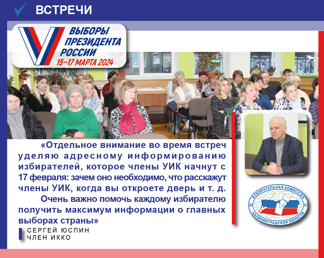 С начала декабря 2023 года член избирательной комиссии Калининградской области Сергей Юспин проводит встречи с избирателями муниципалитетов региона, на которых обсуждаются важные вопросы подготовки и проведения выборов Президента России. Встречи проходят в рамках проведения совместных семинаров в муниципальных образованиях с советником Губернатора, председателем Калининградского регионального отделения «Ассоциации Юристов России» Тамарой Кузяевой.