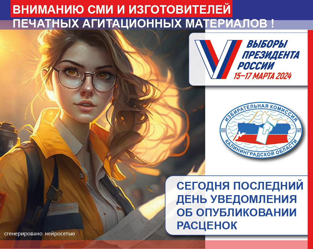 Для СМИ: Сведения о размере и других условиях оплаты эфирного времени, печатной площади, услуг по размещению агитационных материалов в сетевых изданиях должны быть опубликованы не позднее чем через 30 дней со дня официального опубликования решения о назначении выборов Президента России (не позднее 6 января 2024 г.). В этот же срок необходимо уведомить, указав необходимые данные: