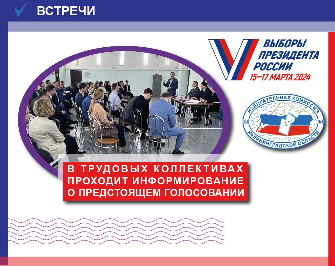 Алексей Гусев и Элина Захарова проинформировали сотрудников АО «Россети Янтарь», «Янтарьэнергосервис», «Янтраэнергосбыт» и Калининградской генерирующей компании о проводимой работе по подготовке к проведению голосования в Калининградской области на выборах Президента России, которое состоится 15,16 и 17 марта 2024 года.