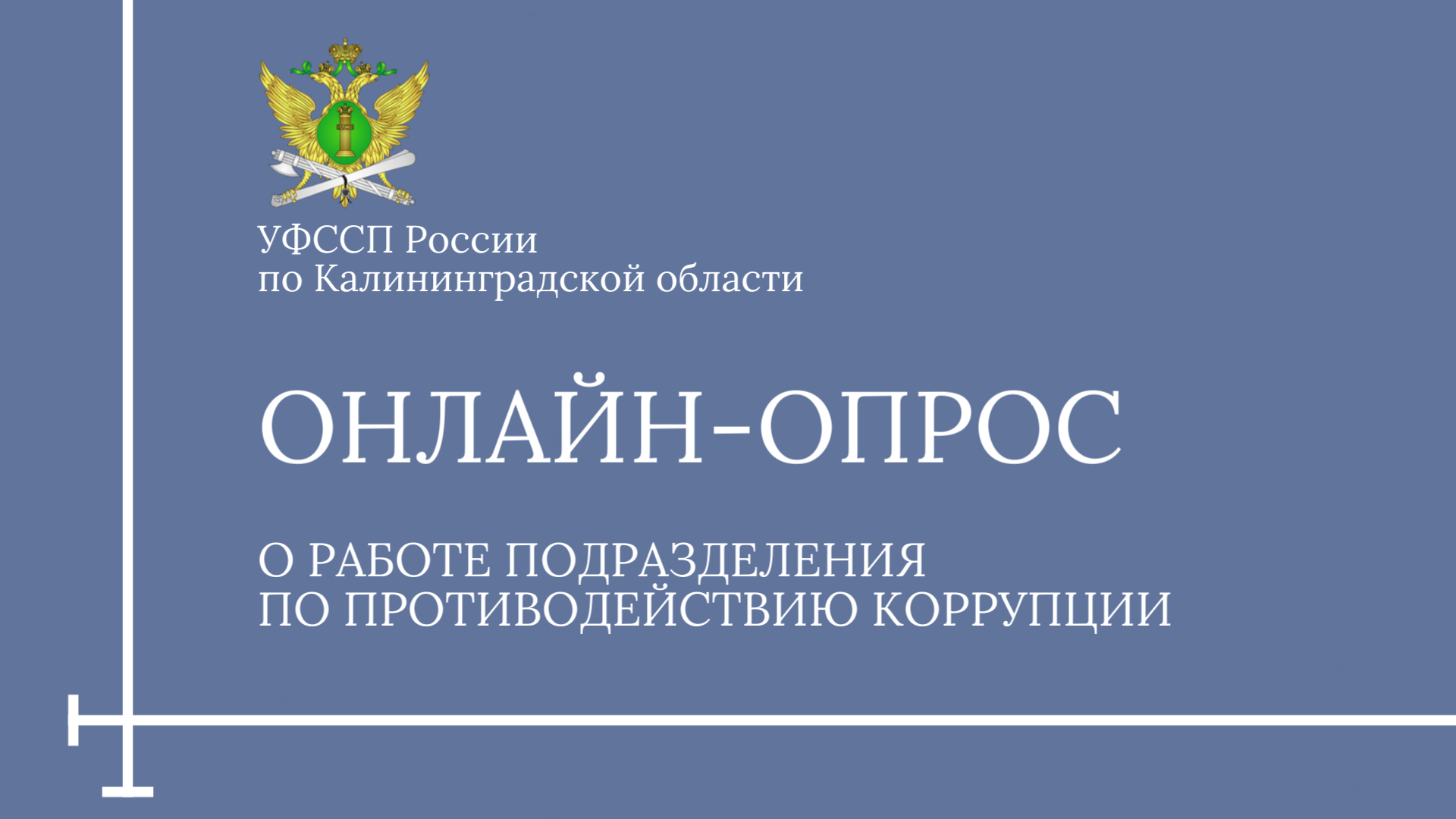 С 15 января по 15 февраля 2025 года на сайте УФССП России по Калининградской области будет проведен онлайн-опрос, который поможет оценить работу подразделения по противодействию коррупции.