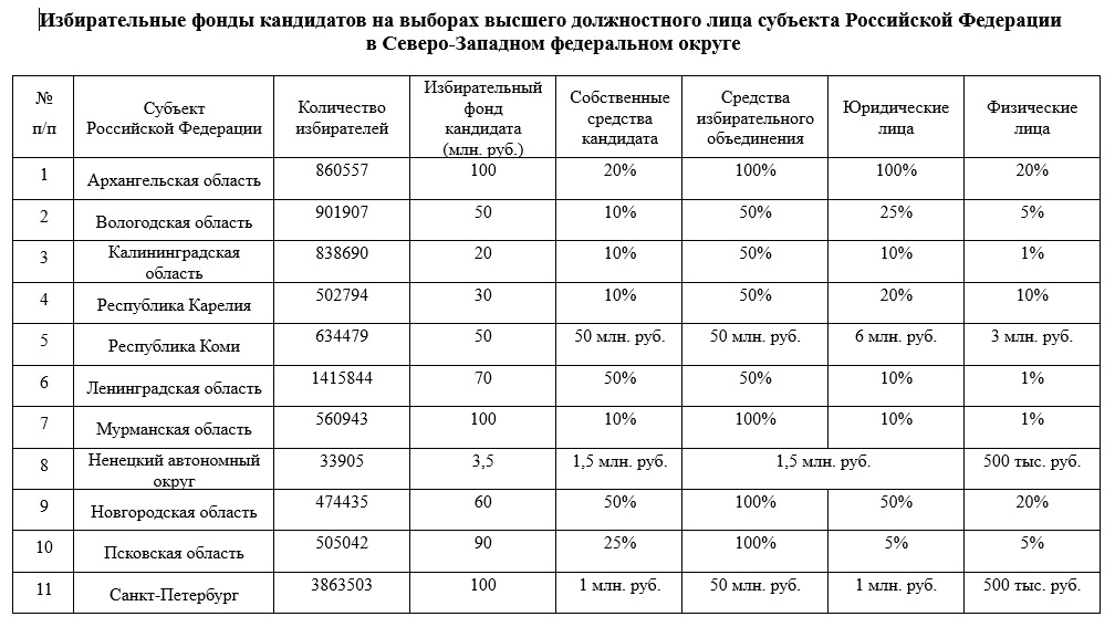 Так, в Республике Коми избирательный фонд кандидата размером 50 млн. рублей может быть полностью сформирован за счет собственных средств кандидата. В Ленинградской и Новгородской областях собственные средства кандидата в избирательном фонде не могут превышать 50% (это 35 и 30 млн. рублей соответственно).