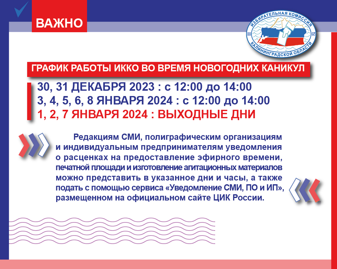 Во время новогодних каникул Избирательная комиссия Калининградской области работает по следующему графику: 30, 31 декабря 2023, 3, 4, 5, 6, 8 января 2024 – с 12:00 до 14:00 1, 2, 7 января 2024 -выходные дни.