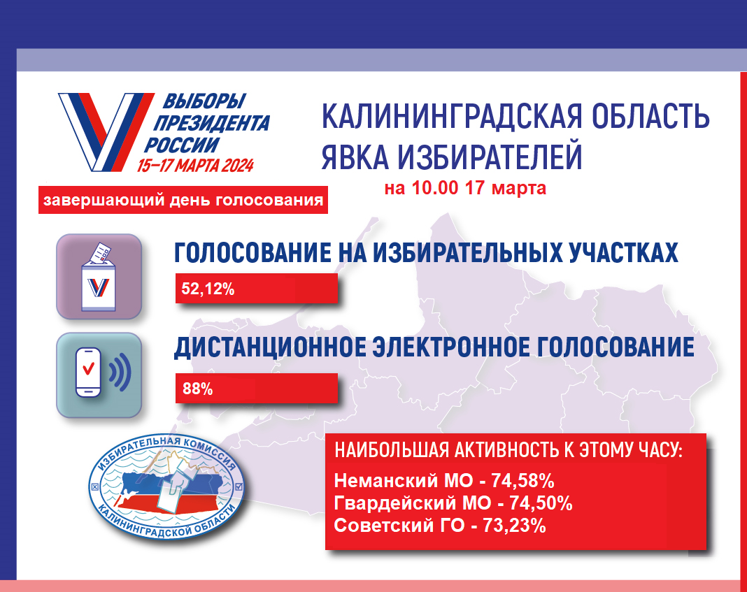 ➡️По состоянию на 10.00 17 марта явка избирателей на выборах Президента России в Калининградской области составляет 52,12% Это 403 728 избирателей.
