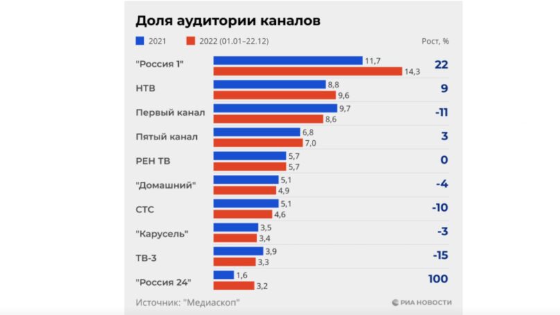 В 2022 году сменилось направление большинства телеканалов – увеличилась доля новостного и аналитического контента, сократилось время развлекательных программ. Среди ежедневных новостных программ лидируют «Вести» («Россия 1») с рейтингом 5% и долей аудитории 16,6%, что на 20,3% выше показателей прошлого года. Второе место заняла программа «Сегодня вечером» («НТВ») с рейтингом 2,7% и долей аудитории 10,2% (на 21,4% выше, чем в прошлом году). «Время» («Первый канал») растеряло часть аудитории и оказалось на третьем месте с рейтингом 3,2% и долей аудитории 10,7% (на 1,8% ниже, чем в прошлом году).
