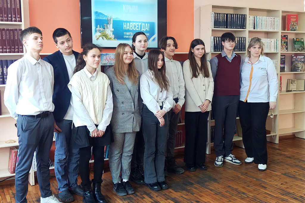 18 марта 2014 года произошло важное историческое событие нашей Родины – воссоединение Крыма с Россией. В преддверии этой праздничной даты в библиотеке прошёл информационный час «Россия и Крым – навсегда!», посвящённый девятой годовщине официального вхождения Крыма и города Севастополя в состав Российской Федерации.