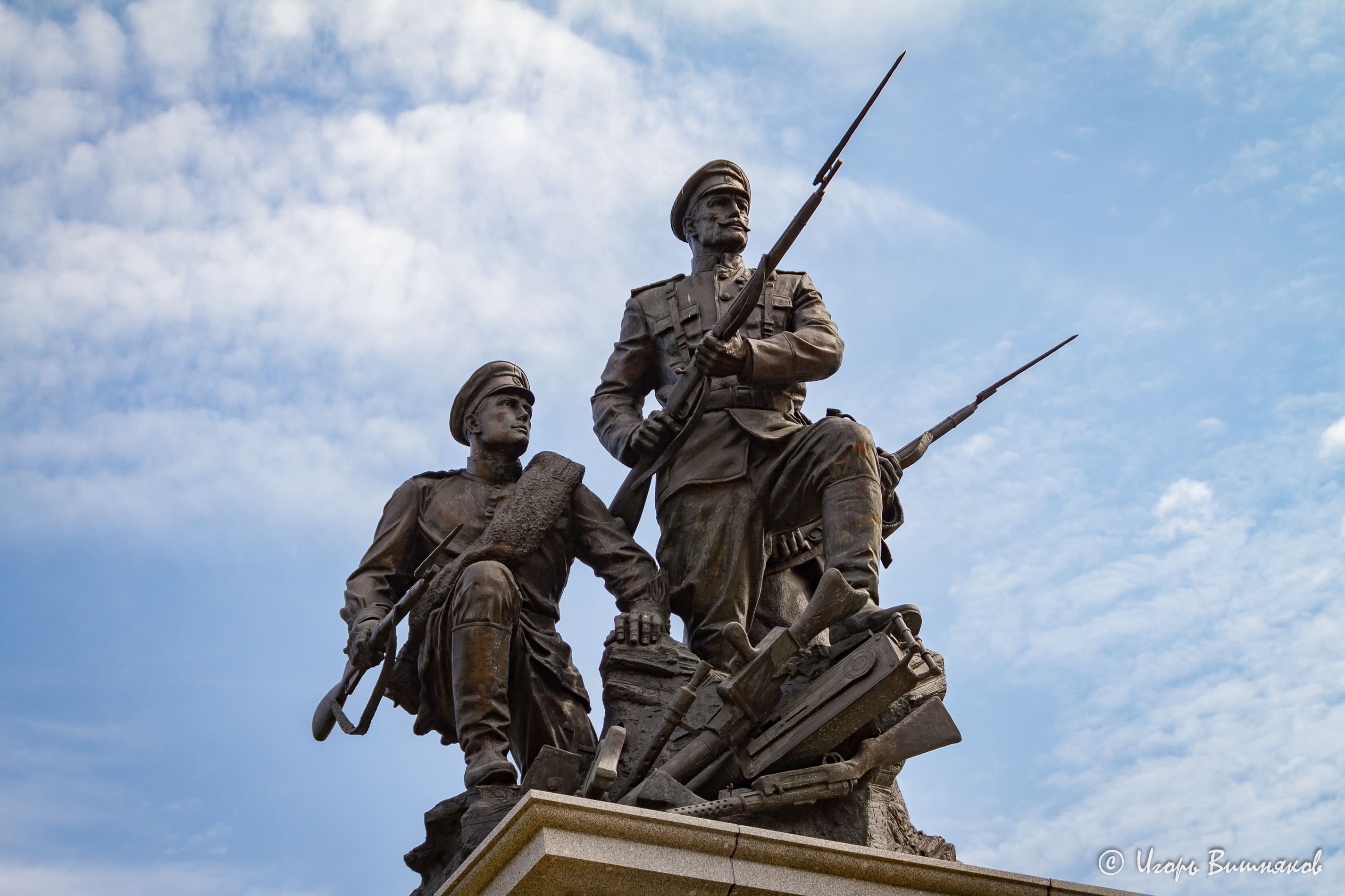 На одиннадцатиметровом гранитном постаменте возвышаются бронзовые фигуры трёх русских воинов, идущих в атаку. Люди, изображенные Народным художником Российской Федерации скульптором Салаватом Щербаковым и архитектором Игорем Воскресенским, разных сословий и возрастов – офицер, солдат и крестьянин.