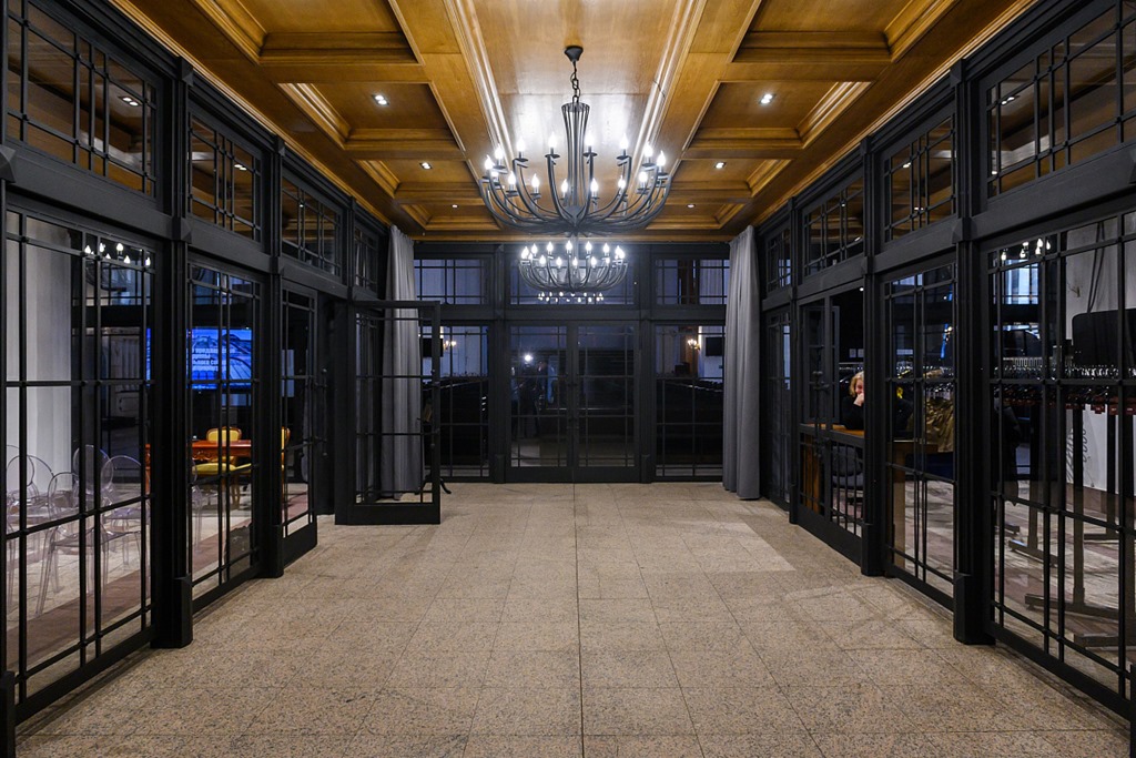 Фойе значительно преобразилось: на месте деревянных перегородок появилось стекло в темной огранке металла, вместо традиционного гардероба установленавтоматический. В левой части холла расположилось дополнительное выставочное пространство. Также трансформировались потолок и система освещения. По периметру гардеробной и нового выставочного пространства появились непроницаемые шторы, которые визуально разделяют зал и фойе на время концерта.