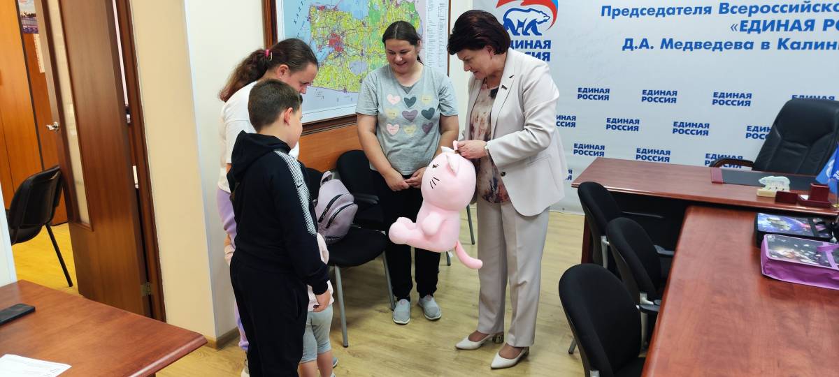 Семья Татарчук проживает в посёлке Волошино Зеленоградского района, они воспитывают троих детей. Двое старших – Милана и Тимур – школьники. Им депутат вручила рюкзаки с канцтоварами к новому учебному году. А младшей, Марьяне, подарили мягкую игрушку.