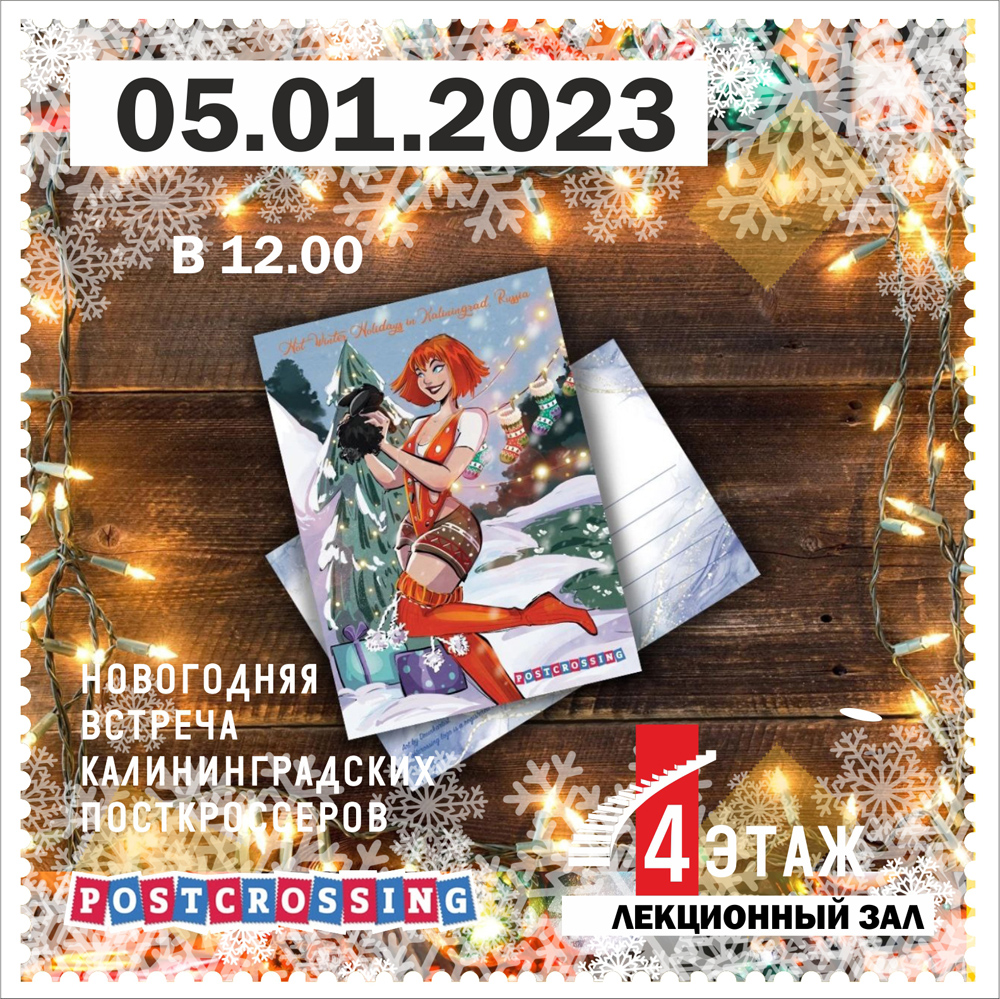 Калининградский клуб посткроссеров приглашает на новогоднюю встречу. Мы подпишем оригинальные новогодние открытки, познакомимся с историей российской и советской новогодней открытки, похвастаемся своими рождественско-новогодними коллекциями. С собой берите марки, канцелярию, штампики, стикеры – всё нужное для оформления открыток. И вкусняшки к чаю на общий стол (по желанию, только не переусердствуйте). Будем рады новичкам!