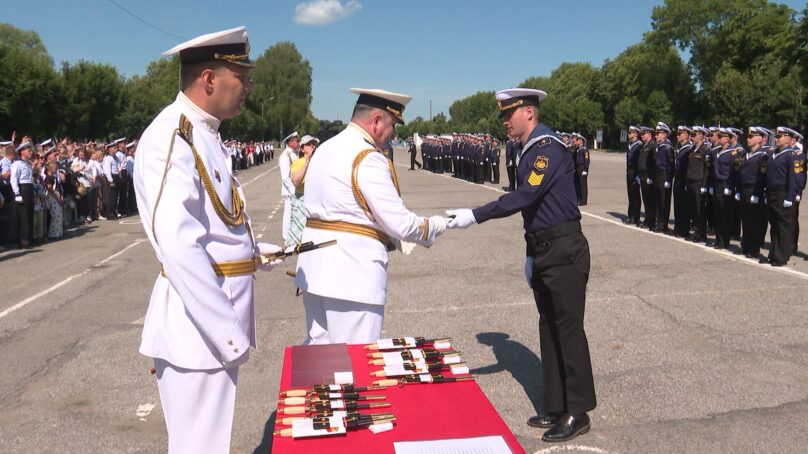 Парадная форма, кортики и погоны. Выпускной прошёл в калининградском военно-морском вузе. Вчерашние курсанты поступали в филиал санкт-петербургской флотской академии, а заканчивали уже самостоятельное учреждение реорганизация завершилась в прошлом году.