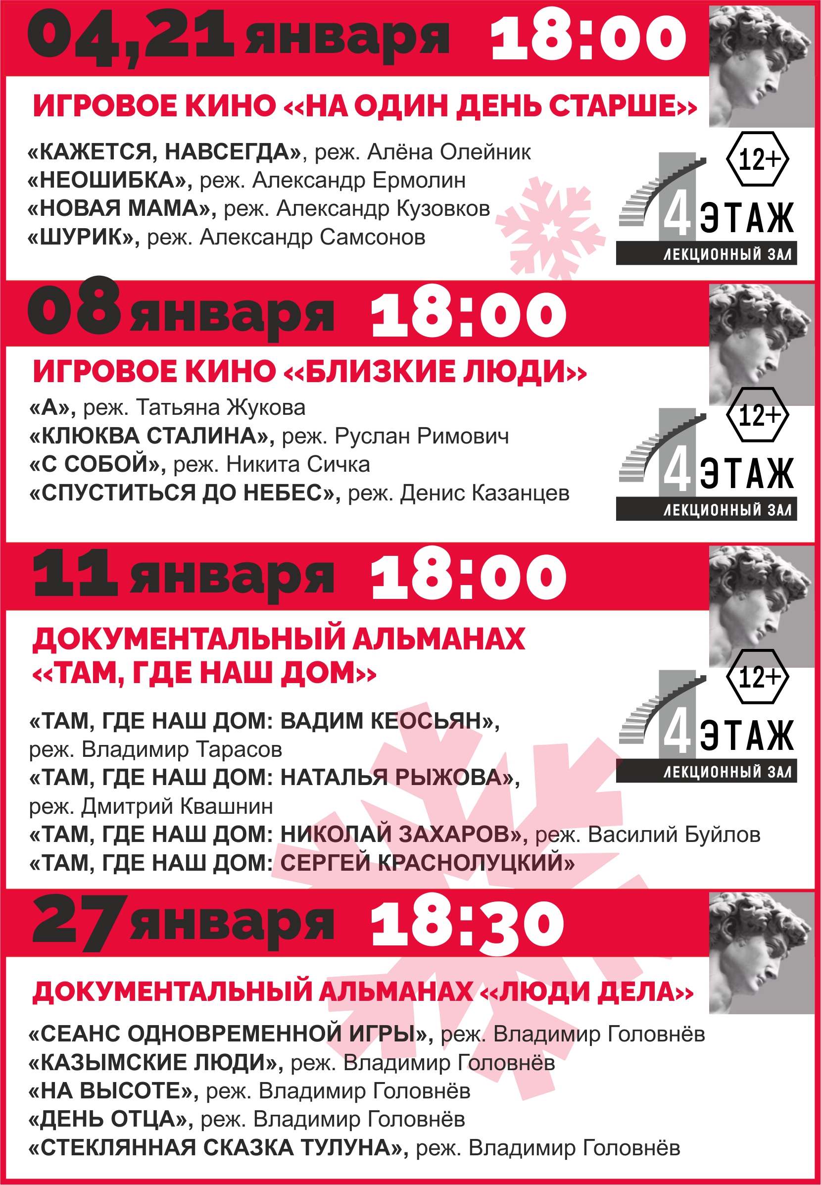 Приглашаем Вас принять участие в кинофестивале и провести самые долгие зимние вечера в компании наших друзей и партнёров! Подробная программа опубликована по ссылке: 4 января - день , 4 января - вечер , 8 января - день , 8 января - вечер , 11 января , 21 января - день , 21 января - вечер , 27 января .