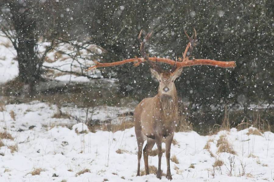 «Этот красавец — завсегдатай полакомиться яблоками-дичками, когда идёт сезон, а в зимний период поедает кору и ветки на этих деревьях. Я его уже знаю. Поедал ветки яблок и зацепился за одну из них. Хотел помочь убрать сук, но олень не подпускает на близкое расстояние и сразу при приближении уносится», — рассказал участковый лесничий, имя которого в министерстве не назвали. Впрочем, специалисты отмечают, что уже в конце февраля благородные олени начинают сбрасывать рога, а к середине лета обзаводятся новыми ветвистыми. «Со старыми рогами отпадёт и ветка, если олень ее раньше не зацепит об деревья», — добавили в минприроды.