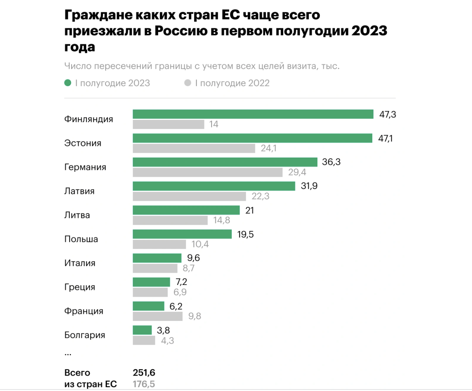 Так, из Финляндии в первом полугодии 2023 года со всеми целями въехали 47,3 тыс. раз (14 тыс. в первом полугодии 2022 года), из Эстонии — 47,1 тыс. раз (24,1 тыс. в первом полугодии прошлого года), из Германии — 36,3 тыс. раз (29,4 тыс. в первом полугодии 2022-го).