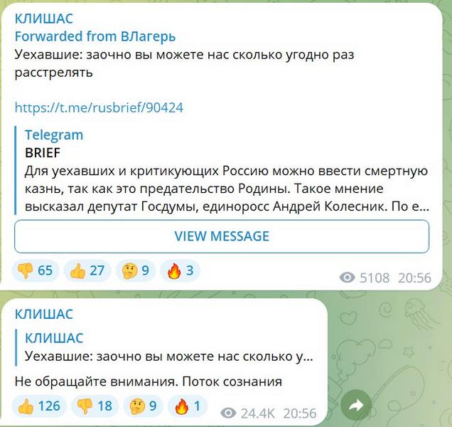 Любопытно, что в своём телеграм-канале сенатор Андрей Клишас опустил слова Колесника, говоря о «потоке сознания».