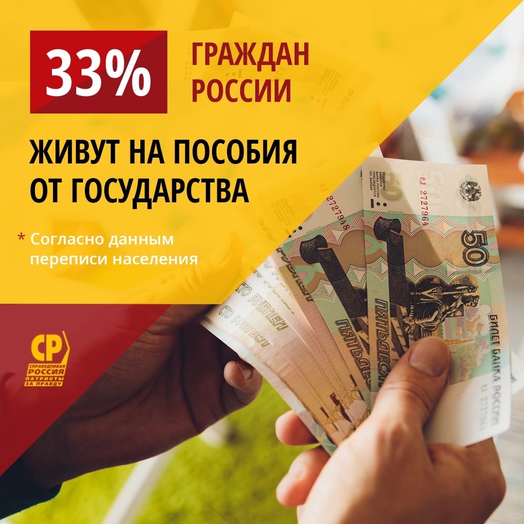 - В ходе переписи 128, 8 миллионов россиян указали источники средств к существованию. Согласно этим данным 33% наших сограждан (42,7 млн. человек) в качестве источников дохода указали пособия от государства. Причём для 31 млн. государственные выплаты являются главным источником дохода. Иначе говоря, треть россиян зависят от государственной поддержки. Эти цифры соответствуют масштабам реальной бедности, которая в полтора-два раза превышает официальный уровень.