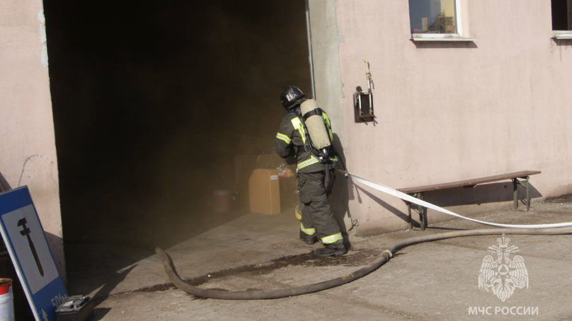 Пожар произошел 12 мая. Сотрудники МЧС России установили, что внутри ремонтного бокса хозяйственно-административного здания горел автомобиль. Тушение осложнили густой дым и высокая температура.