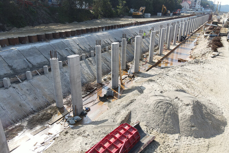Строители подготовили к заливке конструкции стен лестничного спуска. Смонтировали ростверки — верхнюю часть свайного фундамента, которая будет нести основную нагрузку, положили плиты перекрытия. Новая набережная будет защищать подножье склона от размывания волнами и грунтовыми водами. Работы планируют завершить к концу 2024 года.
