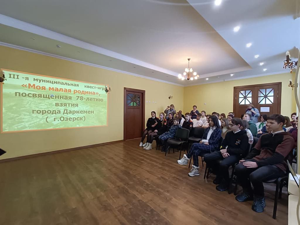 27 января 2023 года в Центре развития творчества прошла III-я муниципальная квест-игра «Моя малая родина», посвященная Дню взятия советскими войсками города Даркемен (г. Озерск). В Квест-игре приняли участие обучающиеся пяти образовательных организаций МО «Озерский муниципальный округ»- это команды Озерской средней школы имени Д. Тарасова, ГБУ КО ПОО «Колледж агротехнологий и природообустройства, Новостроевской средней школы, ООШ п. Ушаково, ООШ п. Ново-Гурьевское.