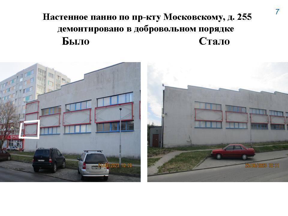 Добровольно собственники расстались с семью конструкциями. Владельцы самостоятельно сняли два световых короба по ул. Шевченко д.1 и Б.Окружная 4-ая д.35. Пять настенных панно демонтировали с фасада д.255 по Московскому проспекту.