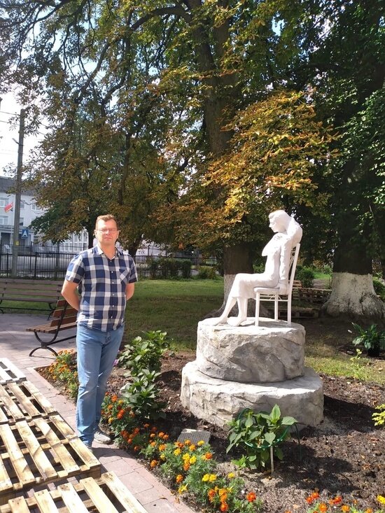 Памятник из цементной смеси украшает сквер городской библиотеки. Скульптор пояснил, что это был частный заказ.
