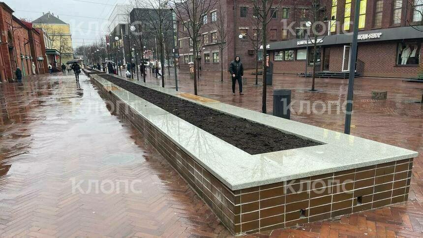 Фото: «Клопс»На Баранова применили клинкерный кирпич, который не выдержал особенностей калининградского климата. «Клопс» писал о том, что лавки уже пришли в негодность. Осенью на местном «Бродвее» начались работы , со второй попытки подрядчик привёл в порядок только третий вазон.