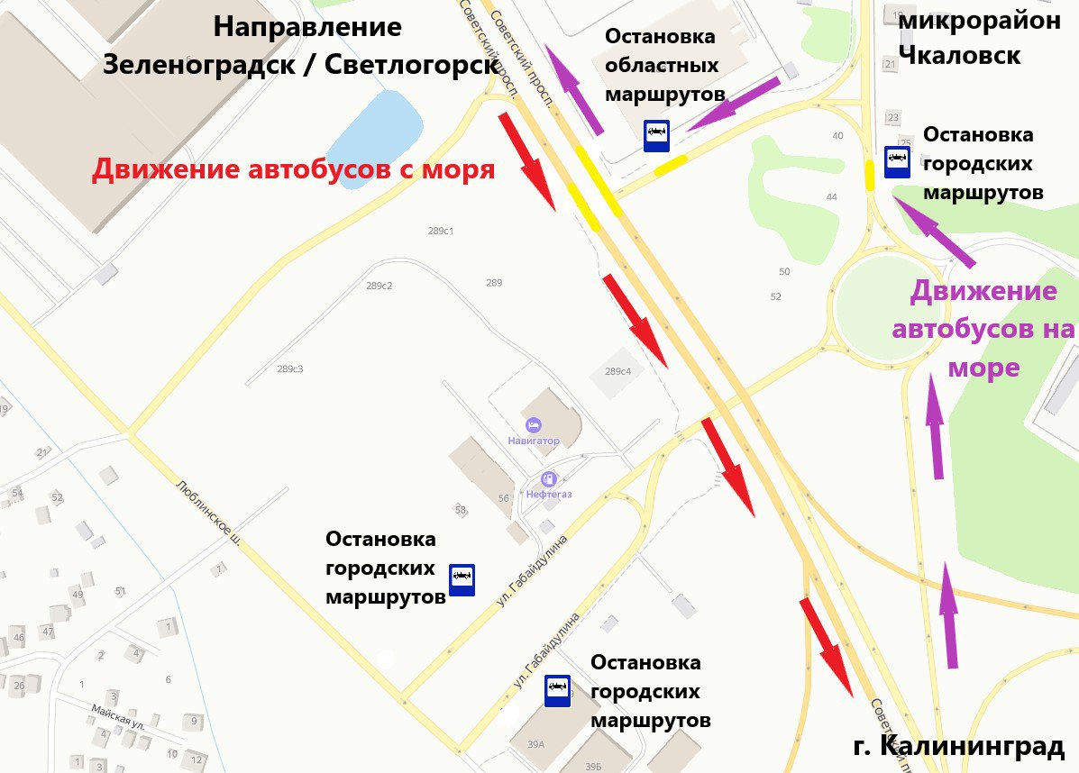 Маршруты № 31 «ул. Б. Окружная 4-ая – мкр. Чкаловск», № 36 «ул. О. Кошевого – мкр. Чкаловск», № 72 «завод «Янтарь» – мкр. Чкаловск» по направлению к конечному остановочному пункту «мкр. Чкаловск» поедут: по Советскому проспекту, ул. Габайдулина (через перекрёсток с круговым движением) и далее по существующим схемам движения. В обратном направлении: по ул. Габайдулина (через перекрёсток с круговым движением, тоннель), Люблинскому шоссе, Советскому проспекту и далее по существующим схемам движения.