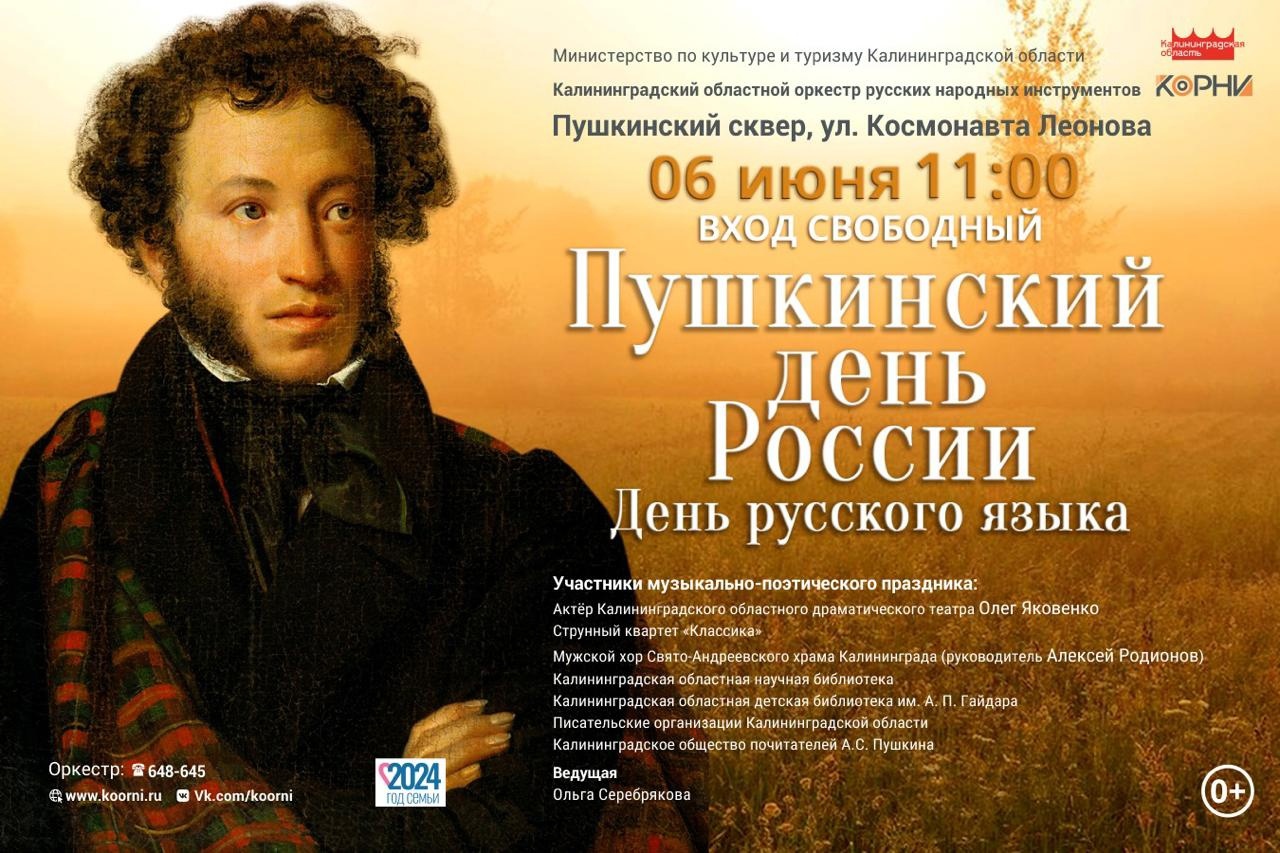 6 июня в 11.00 в Пушкинском сквере на улице Космонавта Леонова начнётся музыкально-поэтический праздник, посвящённый Пушкинскому дню России и Дню русского языка. Ведущая мероприятия Ольга Серебрякова расскажет о жизненном и творческом пути Александра Сергеевича Пушкина, которого по праву считают создателем современного русского языка. В мероприятии примут участие Калининградская областная научная библиотека, Калининградская областная детская библиотека им. А. П. Гайдара, писательские организации Калининградской области и Калининградское общество почитателей А.С. Пушкина.