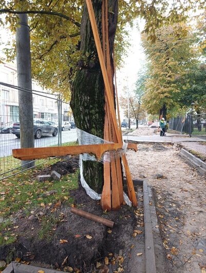В Калининграде во время ремонта тротуара на проспекте Мира дорожные облепили деревья досками и пищевой плёнкой.