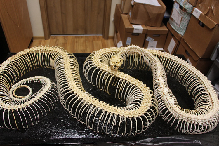 На фото — свежий экспонат — скелет сетчатого питона Жужи. Старушка прожила в зоопарке 28 лет. При жизни обладала тяжелым характером, а после смерти превратилась в настоящее произведение искусства и ценный научный объект.