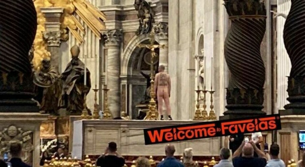 Издание Il Messaggero опубликовало фотографию из соборе Святого Петра в Ватикане, где появился абсолютно голый мужчина с надписью на спине «Спасите детей Украины». Более того, он взошёл на главный алтарь храма, протестуя таким образом против событий на Украине.