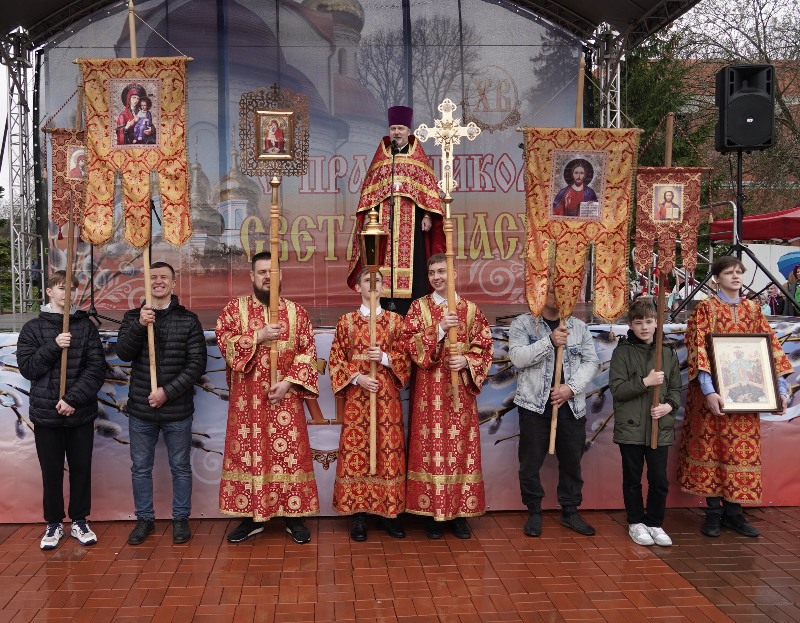После воскресной службы в Храме Вознесения Господня и Крестного хода все традиционно собрались у сцены возле городской администрации.