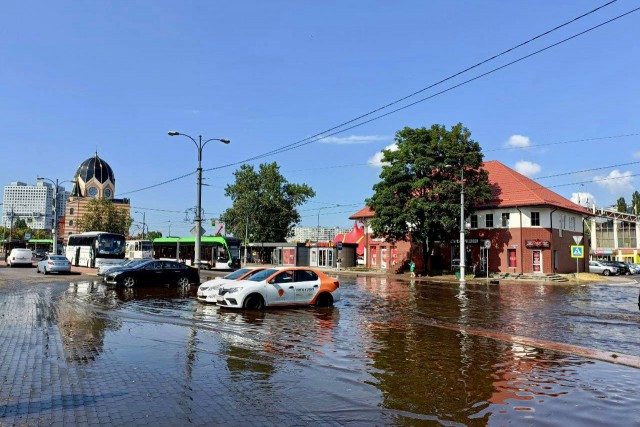 После сильного дождя на острове Октябрьском затопило проезжую часть и парковку. Как передает корреспондент Калининград.Ru, движение трамваев остановлено.