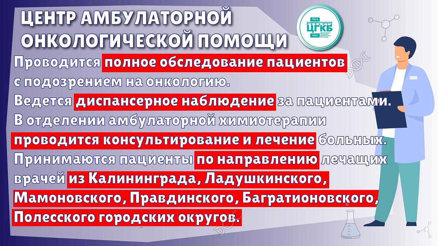 Центр амбулаторной онкологической помощи на базе ЦГКБ (Калининград, ул. Летняя, 3б) оказывает первичную специализированную медико-санитарную помощь в амбулаторных условиях и в условиях дневного стационара в рамках ОМС.