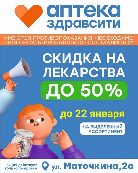 1. В аптеке ежемесячно действуют приятные акции. На этот раз до 22 января скидка до −50% на самые необходимые лекарства. Такие низкие цены не могут не радовать — не удивительно, что приезжают люди со всех районов. Закупился впрок «по дешевке», а как беда настигнет, уже и не задумываешься, куда бежать и откуда деньги брать. Взял из аптечки все необходимое и добрым словом аптеку «Здравсити» вспоминаешь за то, что здоровье поправила и деньги сэкономила.