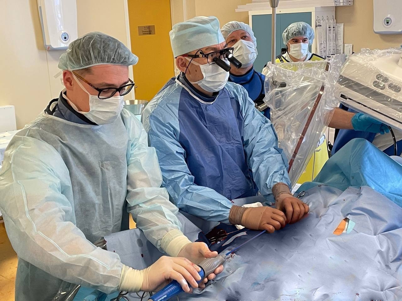 "Это жизнеугрожающее состояние. – поясняет заместитель главного врача по хирургии ФЦВМТ Виктор Цой. – Единственным выходом является протезирование аортального клапана. Традиционный способ замены – операция на открытом сердце с искусственным кровообращением. Нашему пациенту 87 лет, плюс сопутствующие заболевания. Таким больным в большинстве клиник в операции отказывают. Мы же несколько лет назад внедрили и используем миниинвазивную технологию ТAVI. Это транскатетерная имплантация, когда новый клапан через небольшой разрез в сложенном виде доставляется к сердцу по сосудам, затем устанавливается и раскрывается в необходимой позиции. Проводится операция на работающем сердце, под рентген-контролем».