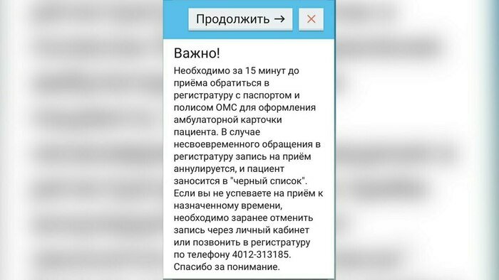 При записи на приём к врачу через систему Medreg39 может появиться уведомление о внесении в «чёрный список» в случае неявки к врачу, но на самом деле добавить туда человека нельзя. Об этом «Клопс» рассказали в региональном министерстве здравоохранения в ответ на официальный запрос.