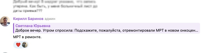 «Сына направили в онкоцентр на МРТ головного мозга 15 июля. А 12 июля нам позвонили и предупредили, что аппарат МРТ сломался», — написала женщина и спросила, починили ли аппарат. «МРТ в ремонте», — ответил Кирилл Баринов.